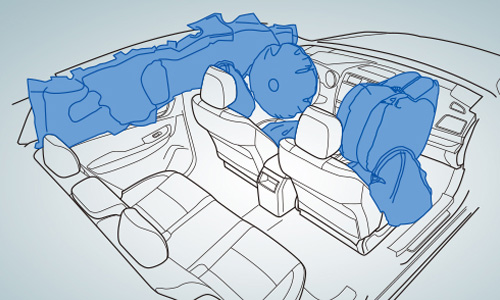 Las bolsas de aire SRS* del asiento del conductor y asiento del pasajero trabajan en tándem con cinturones de seguridad para proteger a los pasajeros. Estos son doblados en un tamaño compacto y se almacenan dentro del volante y tablero e inflan instantáneamente para formar bolsas de aire durante una colisión, proporcionando mayor protección para los pasajeros.