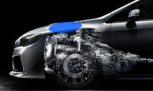 Hay objetos generalmente duros, sólidos como el motor colocado inmediatamente debajo del capó, que limita cuánto choque puede ser absorbido en esa zona. Un motor horizontalmente opuesto sin embargo, se encuentra mucho más bajo en el compartimento del motor que otros tipos de motor. Esto resulta en un amplio espacio entre el capó y la parte superior del motor, dando lugar a una gran zona deformable en el compartimento del motor. Además de utilizar capós de acero, que tienen un alto nivel de absorción de choque, un marco está instalado para asegurar que los choques sean distribuidos uniformemente en toda la zona del capó. La parte delantera del capó también cuenta con un diseño deformable que se puede abrochar fácilmente. Incluso las bisagras y los amortiguadores de gas del capó han sido diseñados para minimizar lesiones a los peatones.